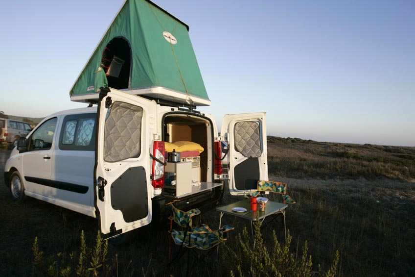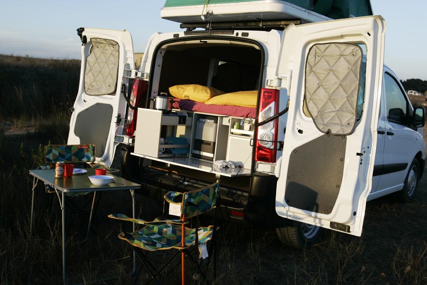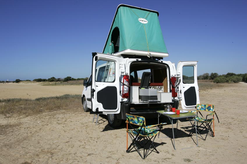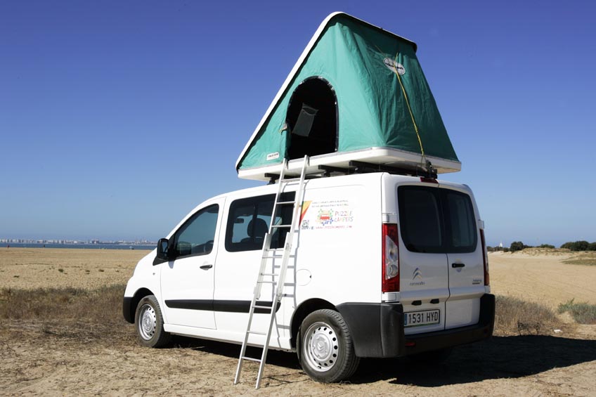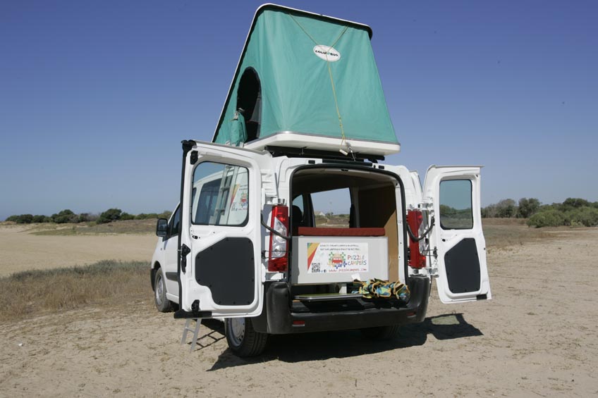 La Puzzle Camper L proporciona enormes dosis de libertad a sus ocupantes gracias al generoso equipamiento interior, que incluye cocina, nevera, fregadero, ducha exterior, depósito de agua de 40 litros y la ya citada tienda de techo, además de una cama interior muy espaciosa.